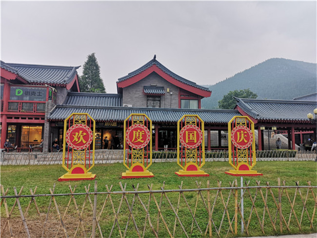 為進一步營造歡樂祥和的節(jié)日氣氛,嵩山景區(qū)于雙節(jié)前,在下轄少林、嵩陽和中岳三大景區(qū)搭建主題為“盛世中國夢”的系列裝置,以中國紅、黃為主色調,結合中式吉祥紋樣、中國結、星形、等節(jié)慶元素累加結合,以中式傳統(tǒng)鏤空雕刻,傳統(tǒng)團扇圖案做圍邊裝飾,突出團圓和美、喜慶隆重的節(jié)日氛圍,彰顯盛世中華的包容氣度,華貴雍容。給游客營造全新、喜慶的節(jié)日喜感,使游客能夠真正感受到國慶期間景區(qū)祥和、舒適的歡樂氛圍。
