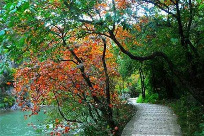 湯河山巔即為熊耳,熊耳群山接天入云,其路似玉帶穿梭奇峽秀峰間,斑斕秋葉盡染數(shù)十里,如水墨丹青畫(huà)卷。
