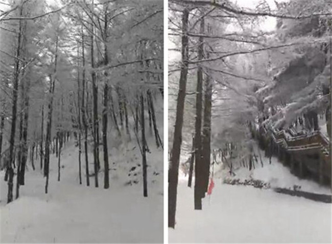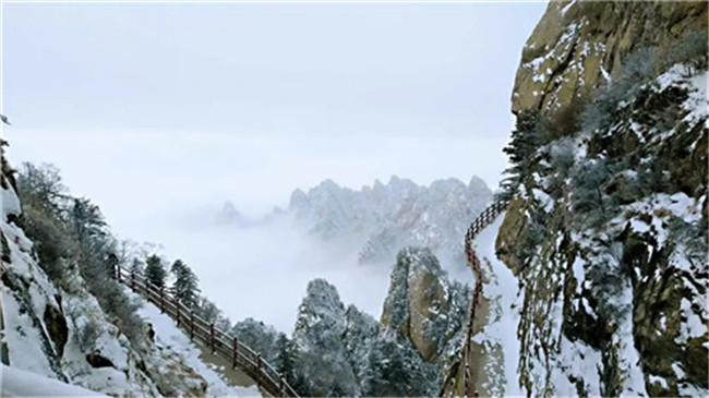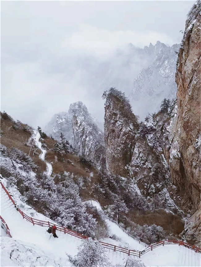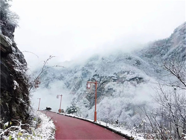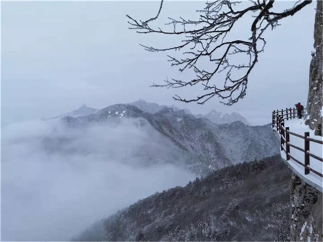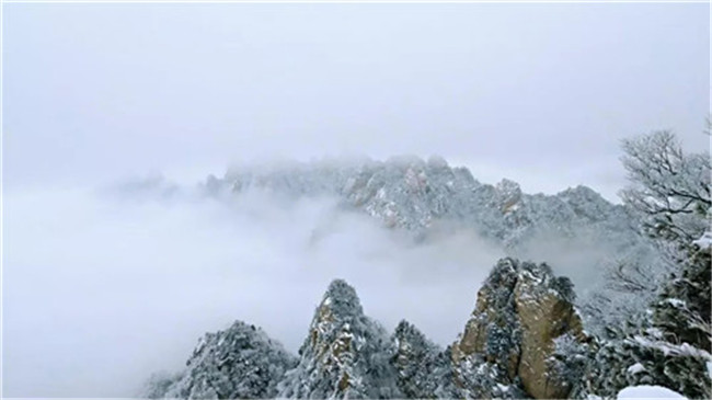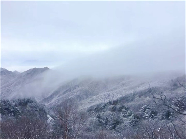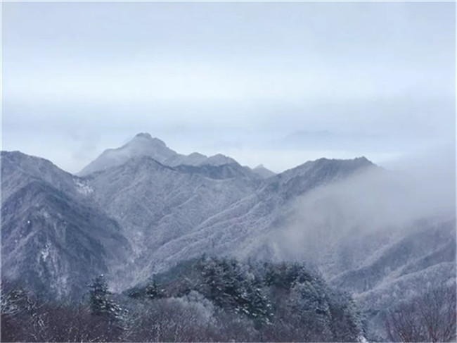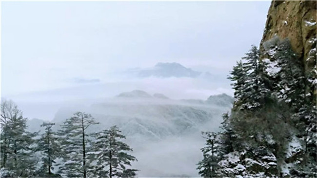 飛雪飄零,幾經(jīng)渲染,山巒上銀裝素裹,玉樹冰花,仿佛置身于高雅的水墨世界。