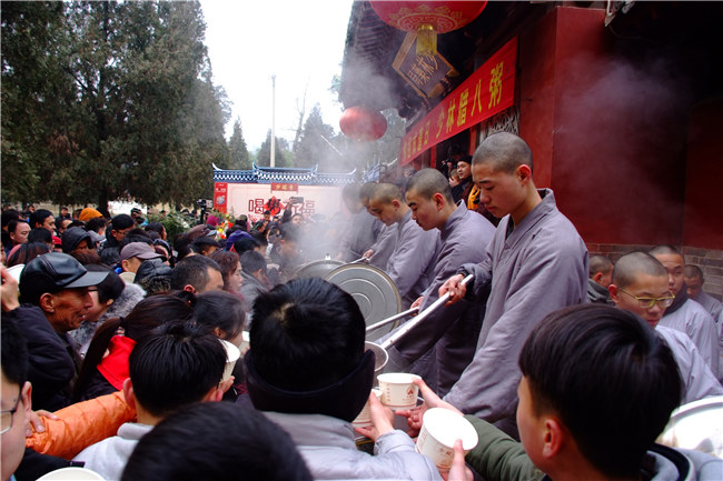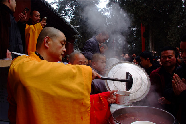 2018年1月24日,農(nóng)歷丁酉年臘月初八,欣逢釋迦牟尼佛成道紀念日,“臘八節(jié)施粥法會”在少林寺山門前隆重舉辦。上午九點,少林藥局延琳法師帶領(lǐng)四眾弟子拈香禮佛,誦經(jīng)祈福,隨后,數(shù)千信眾、游人排隊接受施粥。此次法會意在傳遞佛教平等慈悲、圓融感恩的理念,弘揚中華傳統(tǒng)民俗文化。