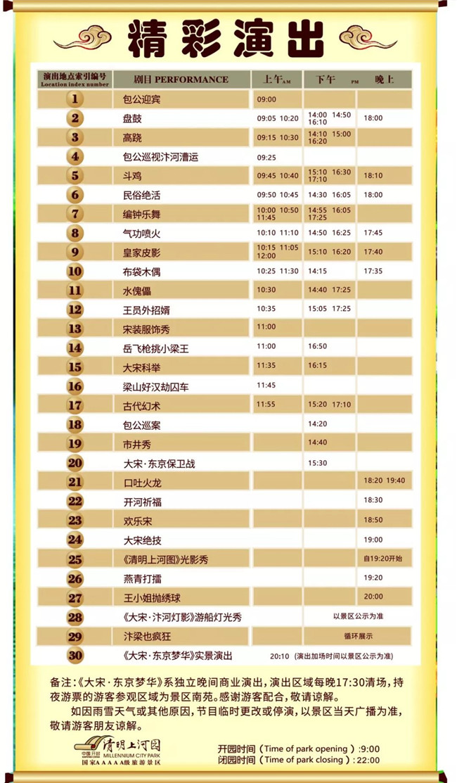 如果你真的是連一天的時(shí)間都不到,只有半天的時(shí)間,那么推薦你下午來(lái),除個(gè)別節(jié)目之外,上午的節(jié)目下午都有,比如:《王員外招婿》《岳飛槍挑小梁王》《大宋·東京保衛(wèi)戰(zhàn)》等,貼個(gè)演出節(jié)目單,想看啥就看啥!
