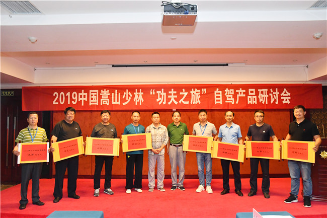 之后,港中旅嵩山景區(qū)黨委書(shū)記常務(wù)副總經(jīng)理郭朝宏與河南省自駕旅游協(xié)會(huì)會(huì)長(zhǎng)王東明為到會(huì)的各省自駕協(xié)會(huì)頒發(fā)2019嵩山少林自駕旅游與代言人證書(shū)。