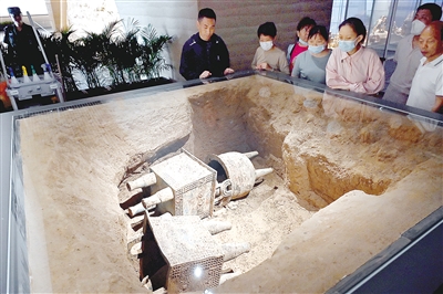 市民在商都遺址博物院參觀青銅器坑(用技術(shù)手段復(fù)原的發(fā)掘現(xiàn)場)