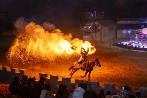夜游的重頭戲當(dāng)屬"牧野之戰(zhàn)·打鐵花"大型演藝。演出以商周牧野之戰(zhàn)為歷史背景,融合國(guó)家級(jí)非遺打鐵花與實(shí)景馬術(shù),1600℃鐵水飛濺如星雨,與舞臺(tái)上的戰(zhàn)馬嘶鳴、刀光劍影形成視聽共振,同時(shí)以現(xiàn)代高科技舞臺(tái)特效,精彩刺激地展現(xiàn)中國(guó)戰(zhàn)將獨(dú)有的情懷和可歌可泣的精神。